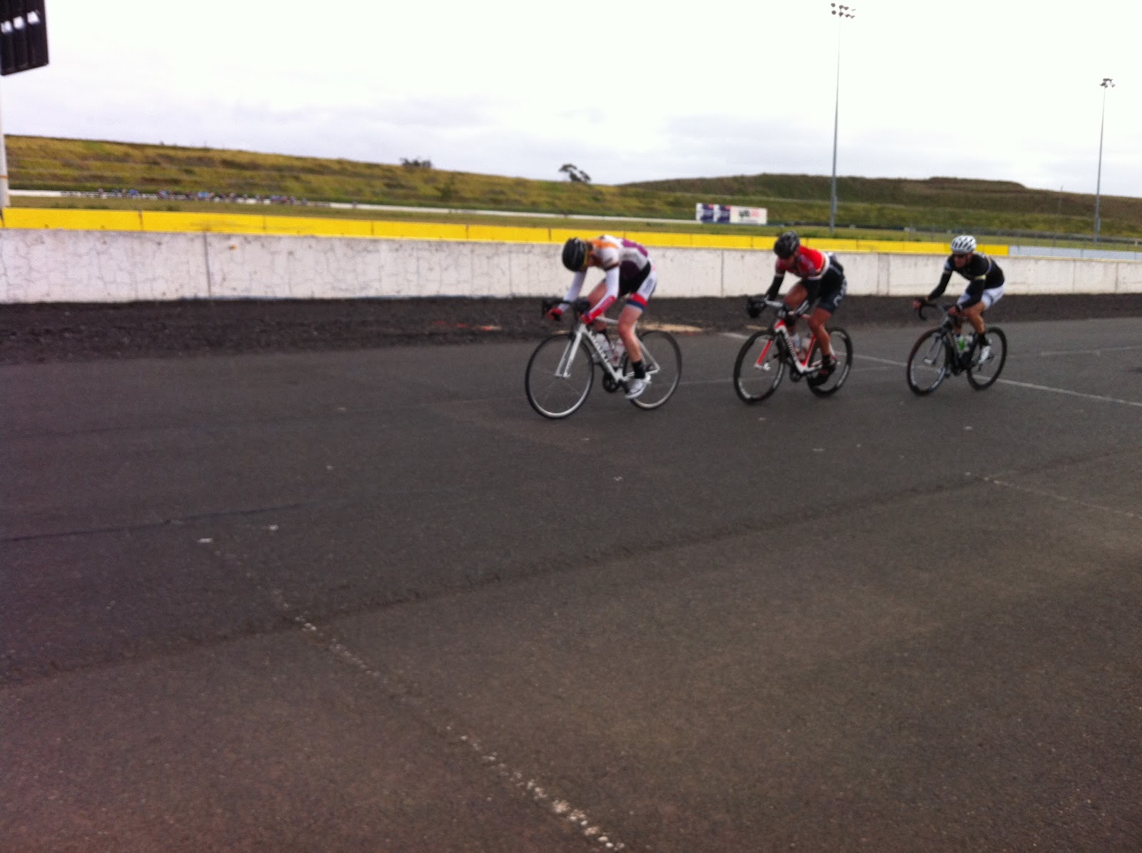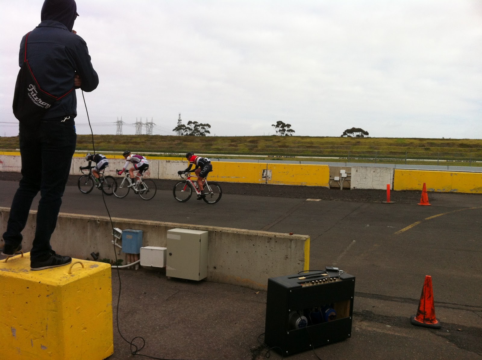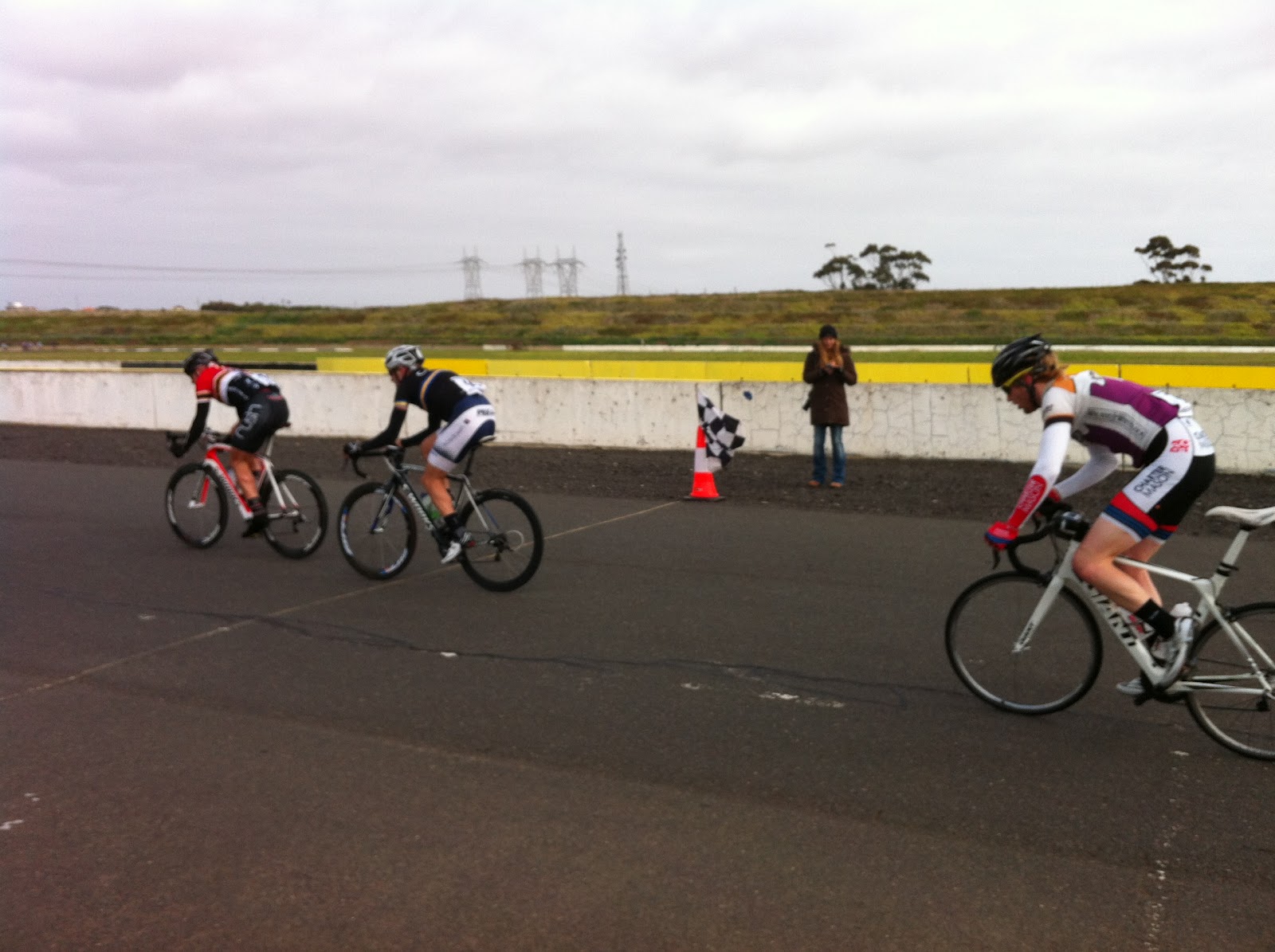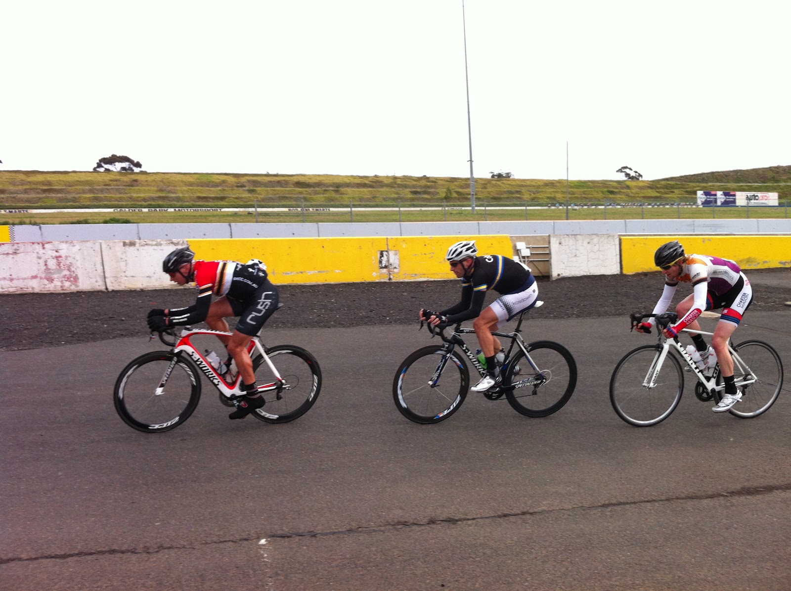 Shannon Johnson (Preston/Charter Mason Drapac) took sprint 1. The much anticipated counter attack/break from sprint 1 went. About 10-12 of us in it. Most teams with two riders in it, Hawthorn (James Gray) and Coburg (me) with one. Johnson made it into the early break/selection for Preston and took the 2nd sprint from David Kelly (SKCC/Total Rush). Gray (HCC) wasn’t playing nice and was rolling off the front of the break causing disruption to the work being done on the front to keep the main field from closing us down. Nathan Elliott (Brunswick/Charter Mason Drapac) was having none of this and attacked solo. I jumped away with David Kelly and 1/2 a lap later the three of us were building a lead from the original break. Johnson, Gray, along with James Butler (Sunbury/John West) and a few others looked to be chasing but didn’t make any ground on the three of us up the road. If you asked me on the start line to pick two riders to be in a break with, I’d have chosen Elloitt and Kelly. Both riders who don’t shy away from time trials, both honest riders who’ll rip turns and make sure a breakaway works. Elloitt is in the best form I’ve ever seen, and Kelly is a steam train who took on the field at Phillip Island solo and won a few weeks back.